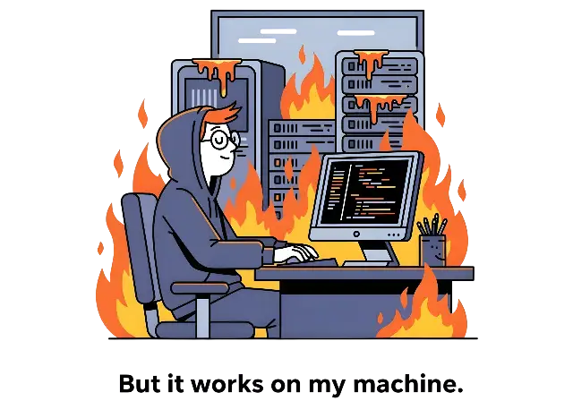 Cartoon Programmer on Fire: 'It Works on My Machine' Tech Humor
