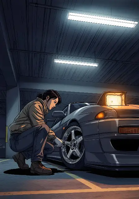 "Anime Woman Mechanic Changing Sports Car Tire Illustration" shows a focused woman changing a sports car tire in a gritty garage, presented in a dynamic anime and manga art style. This artwork is ideal for unique game art, social media content, or automotive merchandise, captivating car enthusiasts and anime fans with its practical, determined vibe.