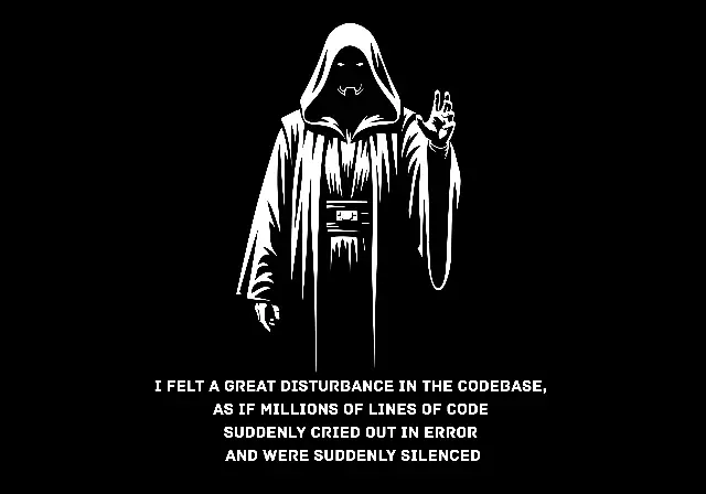 Minimalist Hooded Figure Coding Error Meme for Developers presents a graphic novel style silhouette of an ominous masked figure with a powerful hand gesture. This developer humor graphic is perfect for programmer t-shirts, mugs, or tech merchandise, bringing a dark, nerdy vibe to software engineers.