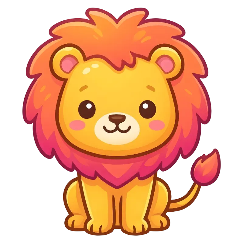 A cartoon lion, rendered in a kawaii aesthetic, shows a seated animal with a fluffy mane. Thick outlines in black define its round form, featuring large eyes, blush cheeks, and an orange and pink gradient mane. The overall tone feels cute, cheerful, and soft.